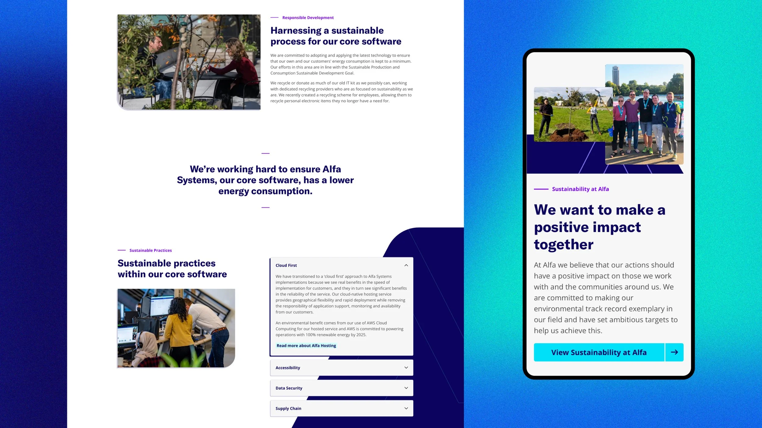 In 2022, it was time to refresh things again for Alfa. The company had evolved and their revised strategy set a new challenge for their brand and its digital future. Their aim was to refresh their website with a strong representation of ESG principles that better reflects their organisational diversity.