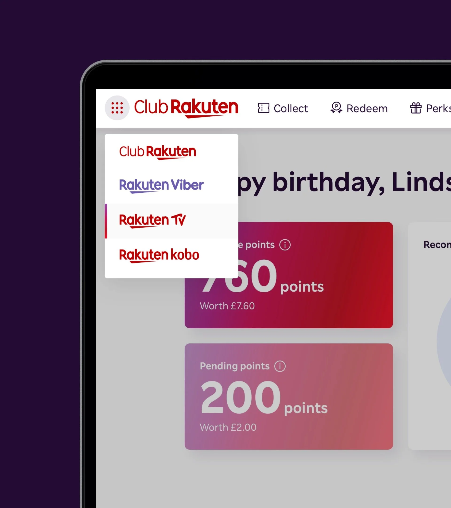 We created Club Rakuten, an exciting new digital hub that allows Rakuten to champion their key principle of ‘rewards made simple’. We achieved this by dividing rewards into three areas: 'Collect' - a place to pick up points by spending through Rakuten’s partner brands, 'Redeem' - a way to convert your points into credit, and 'Enjoy' - a hub of exclusive Rakuten perks. We also applied a fresh design that feels exciting and magical, with micro-interactions and personalised offers that appeal to individuals and families alike.