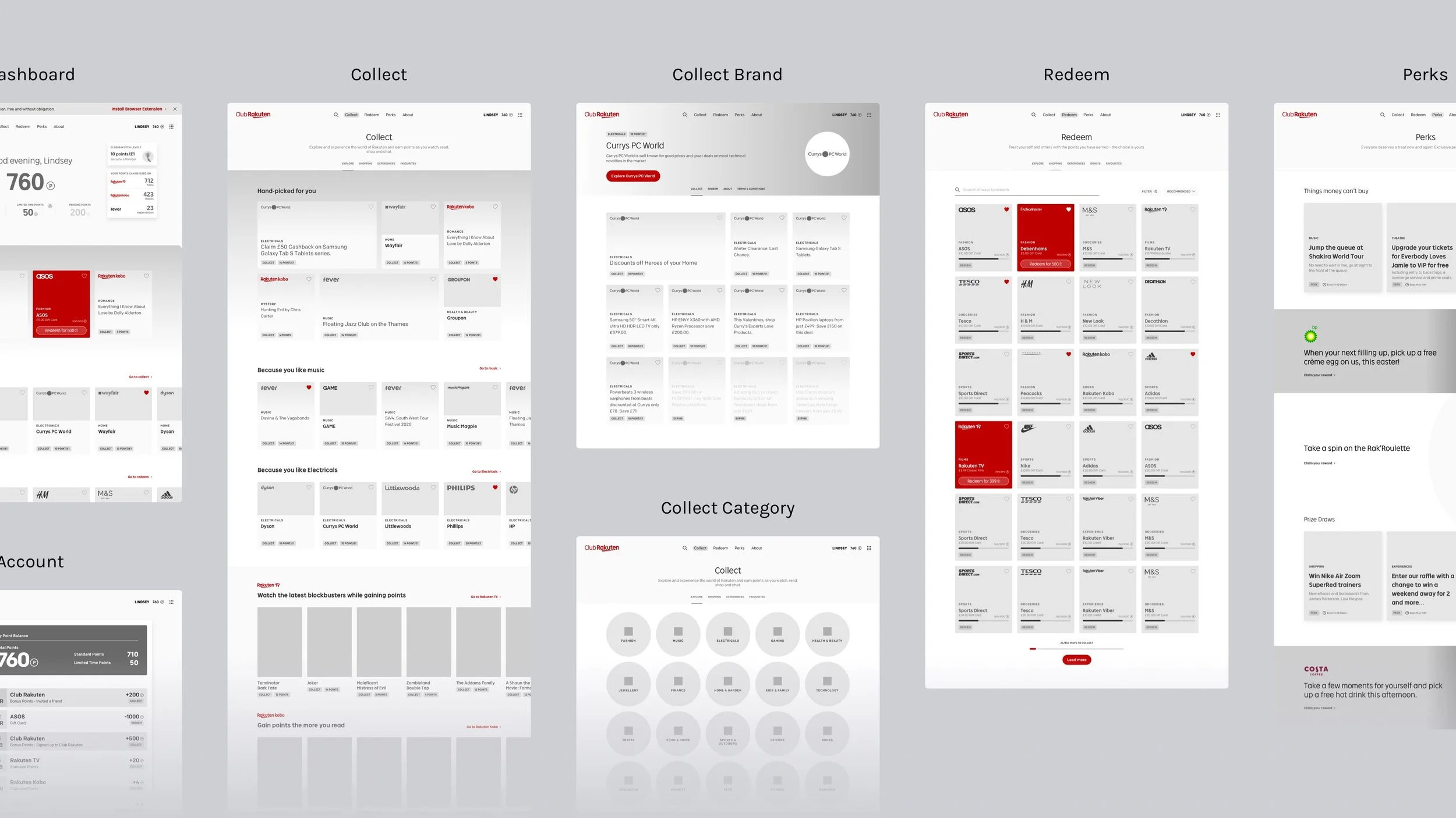 Through extensive research and analysis of all of Rakuten’s business units, and their membership programme ‘Club R’, we understood that they had a lot to offer their customers. However, it wasn’t clearly a collective of products and their rewards system wasn't straightforward. We used wireframing, workshops, and prototyping in an effort to simplify their busy landscape into a singular, digestible product offering, compelling users to keep coming back for more.